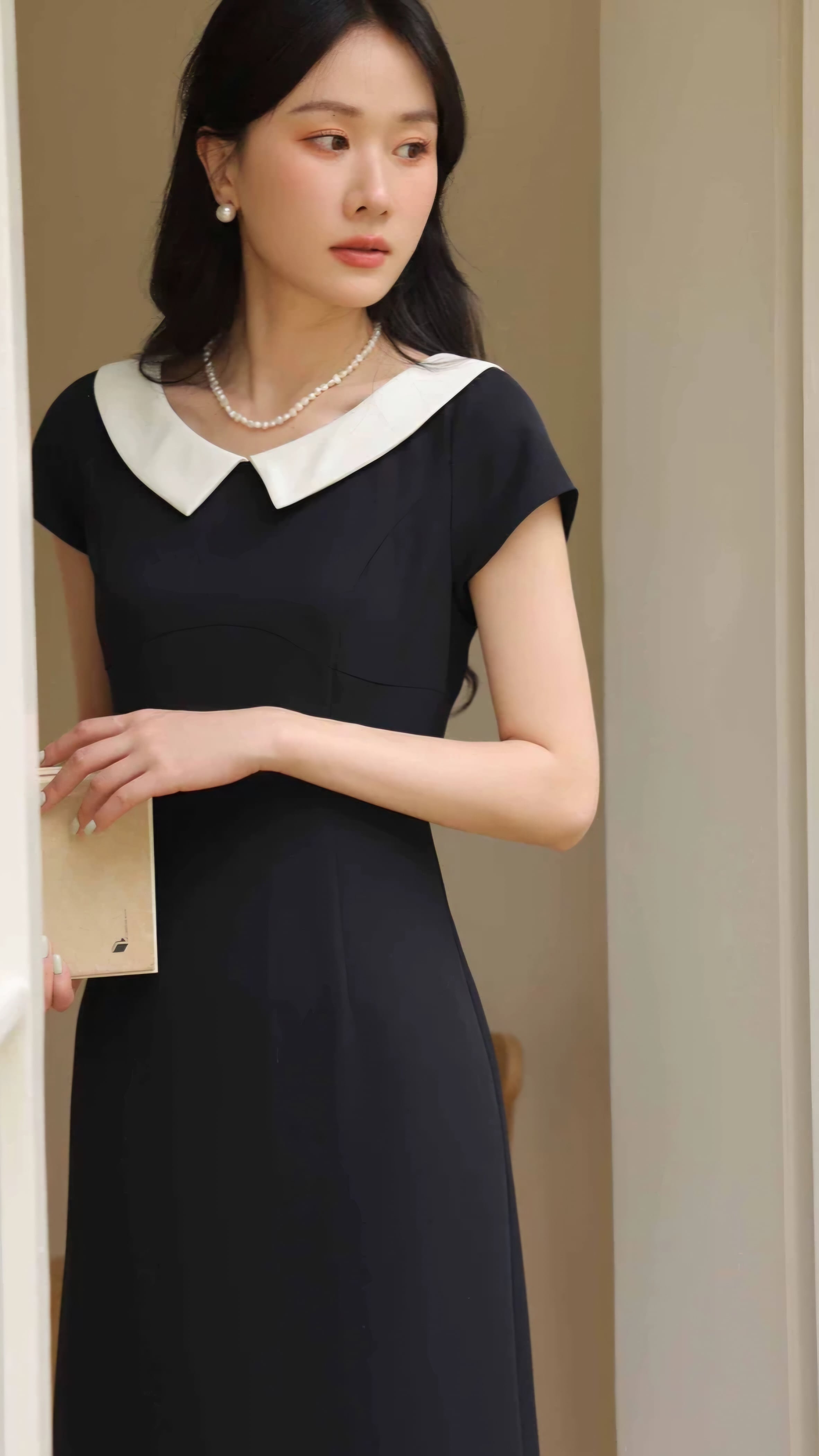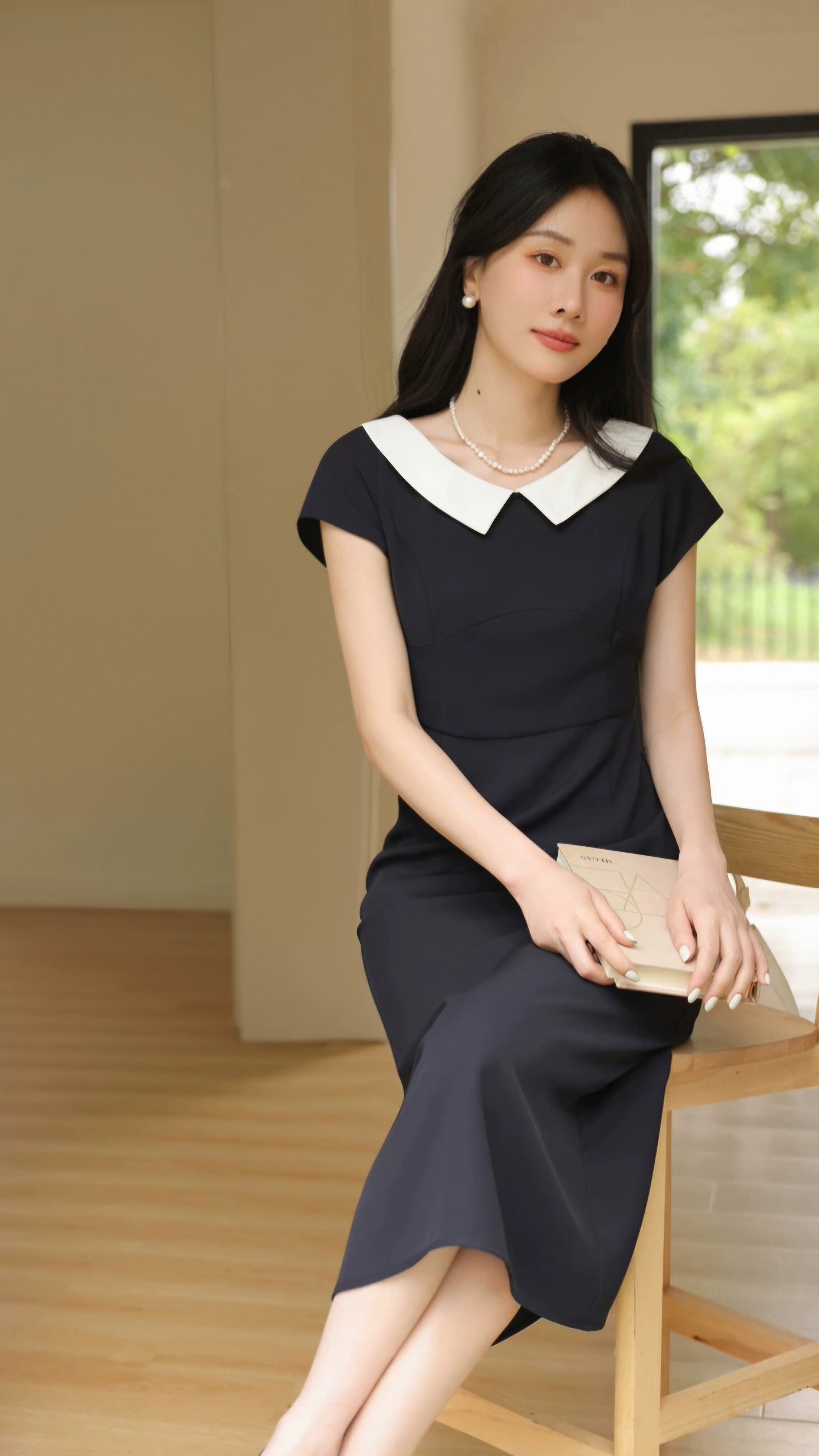 襟付きのラウンドネックがより上品さを演出し、ウエストの切り替えと