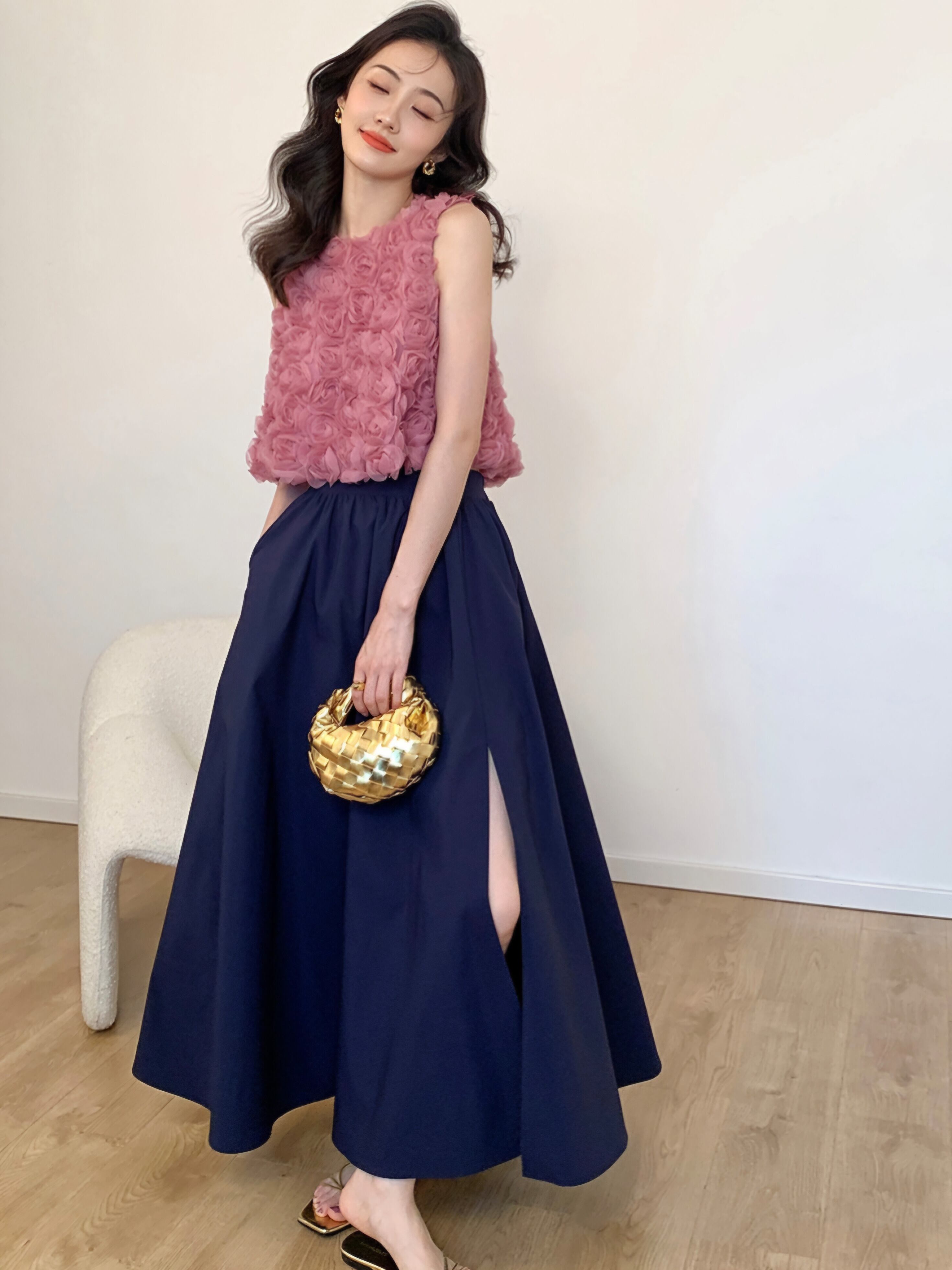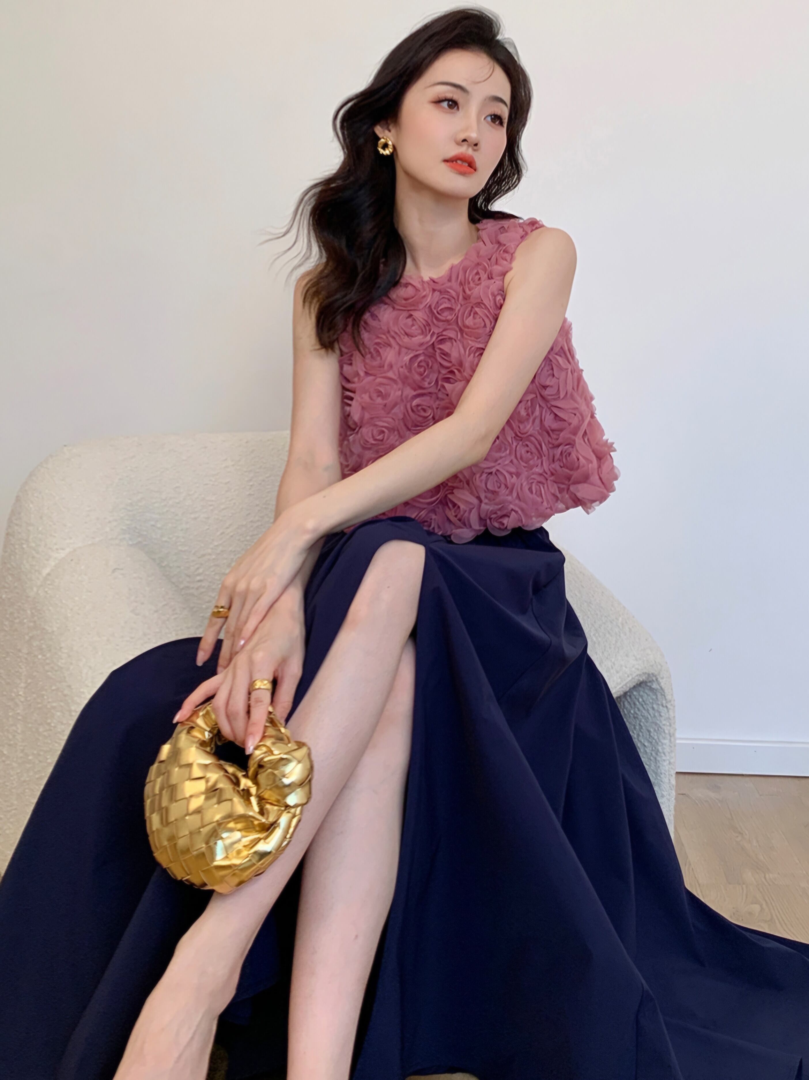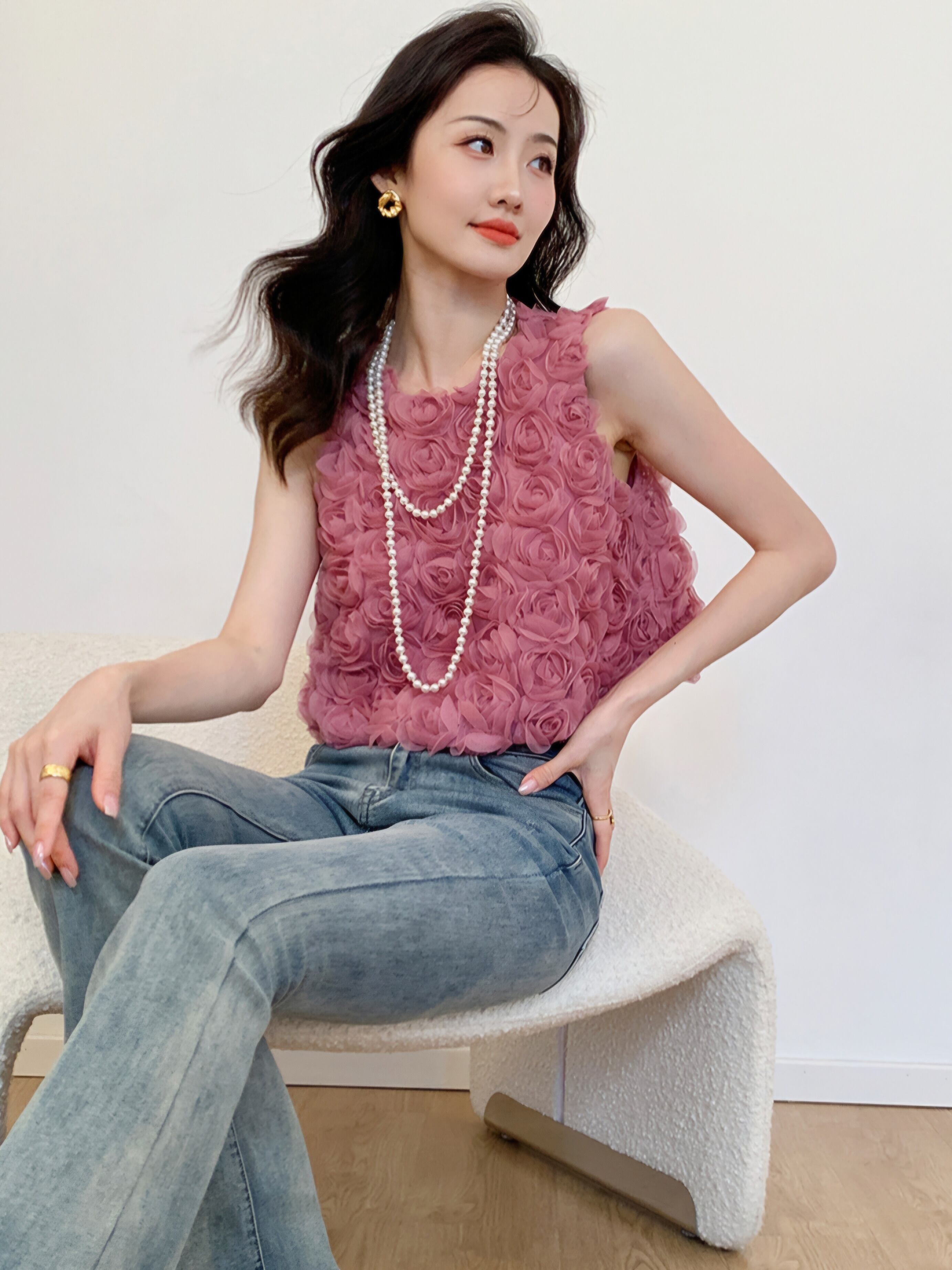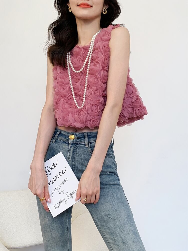 立体的なローズフリルが特徴的で、華やかな印象を与えるノースリーブトップス。大人ピンクの色合いが魅力的な一着。