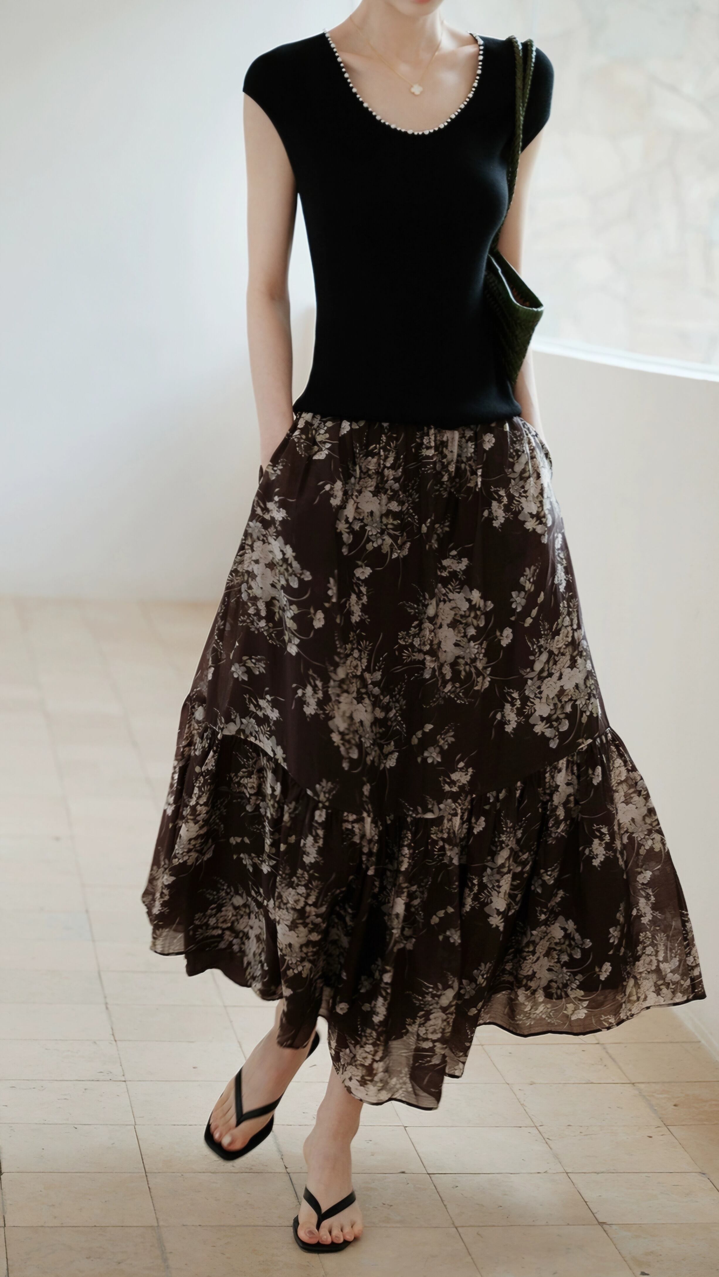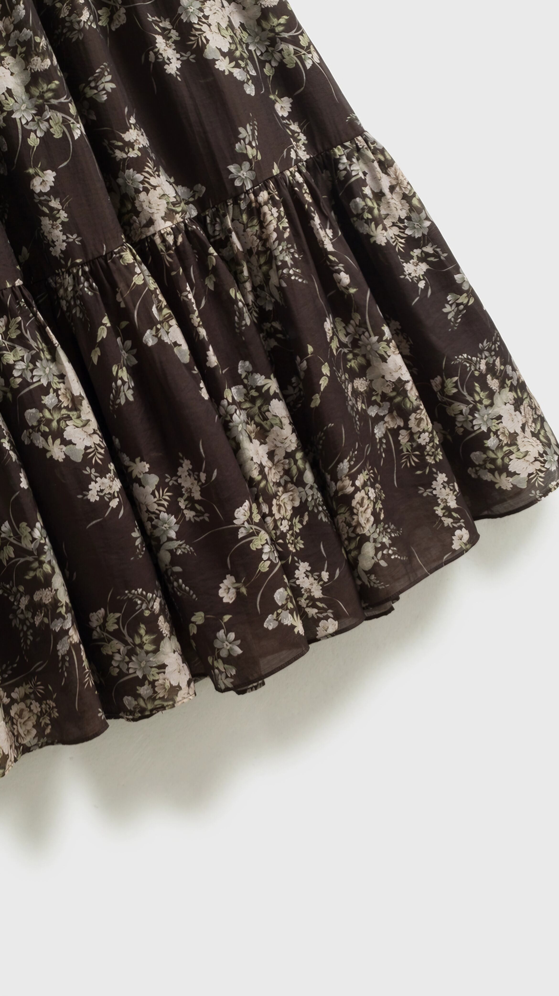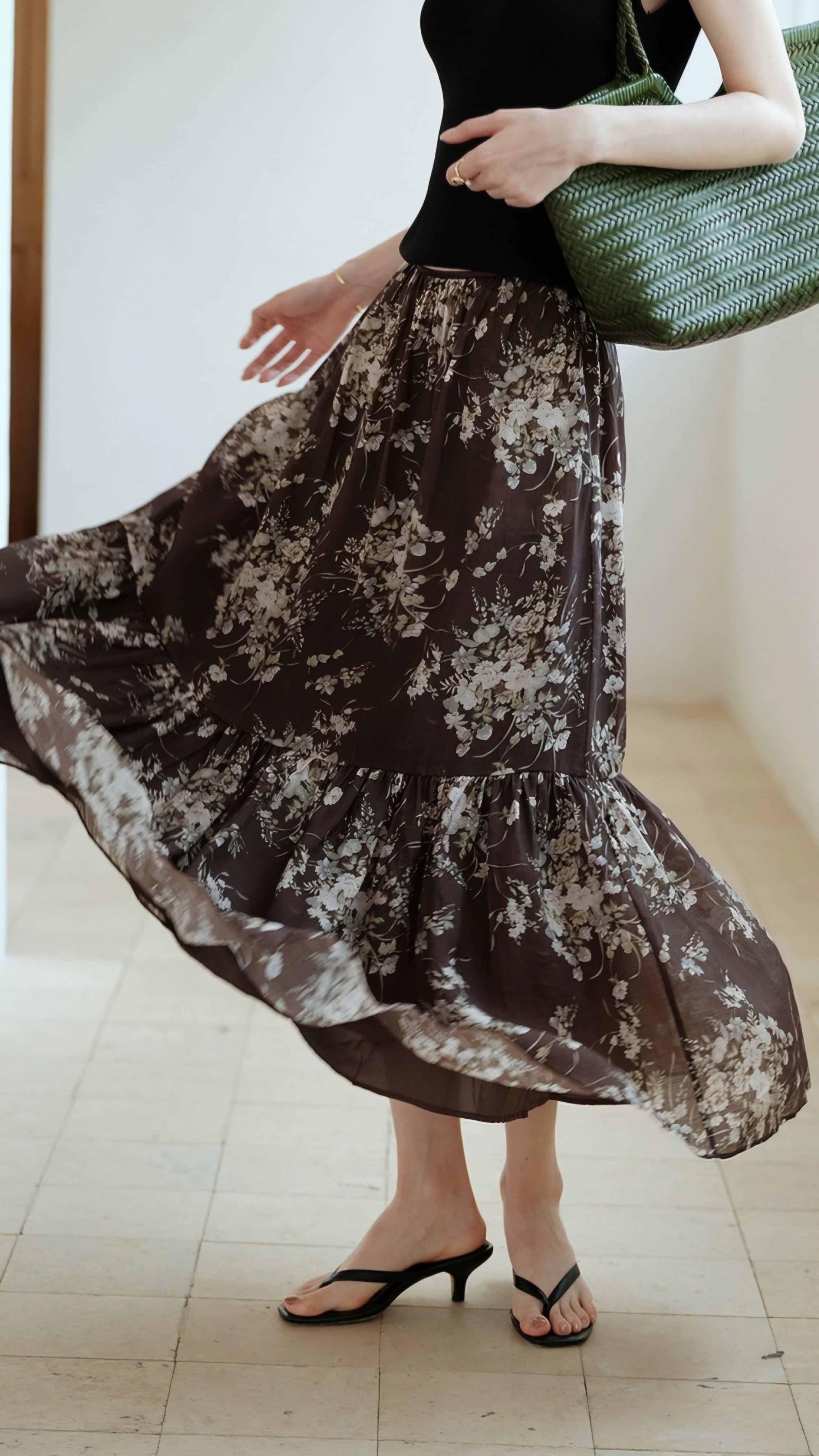 たっぷり生地を使用した、上品なフレアスカートです。ブラウンに施されたフラワープリントで、甘さを控えたシックなデザインは、大人の女性にぴったりのアイテム。とろみのある生地は、しわになりにくいため、デイリーユースにも最適です。